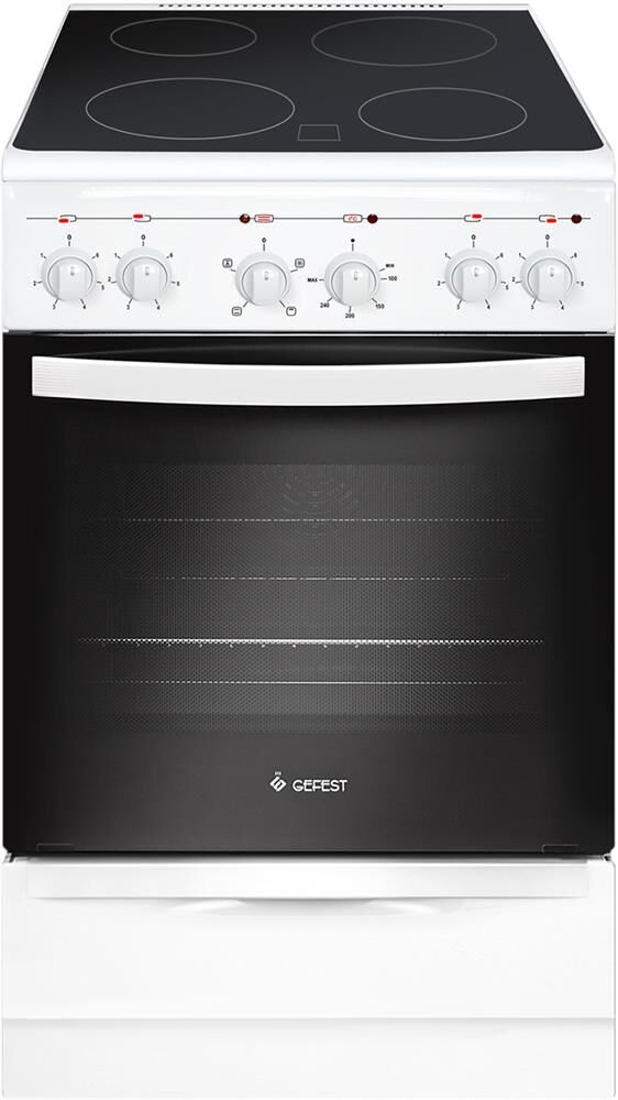 Габариты, ШхГхВ, см: 50x58.5x85; Цвет: белый; Дизайн: классический; Ширина, см: 50; Фасад: эмалированный; Варочная поверхность: стеклокерамическая; Количество зон приготовления: 4; Класс энергоэффективности: А; Диапазон номинальных напряжений, В: 220-230; Номинальная потребляемая мощность электроэнергии, кВт: 5,63-6,15; Объем духовки, л: 52; Конвекция; Мощность верхнего ТЭН духовки, кВт: 0,8; Мощность нижнего ТЭН духовки, кВт: 1,2; ТЭН-гриль: 1,2; Управление: механическое; Гриль: электрический; Подсветка духовки: одинарная; Направляющие духовки: штампованные; Терморегулятор; Ящик для посуды и принадлежностей: выдвижной ящик; Ножки регулировочные; Сетевой шнур и вилка: в наличии; Комплектность: решетка духовки, жаровня 2 шт