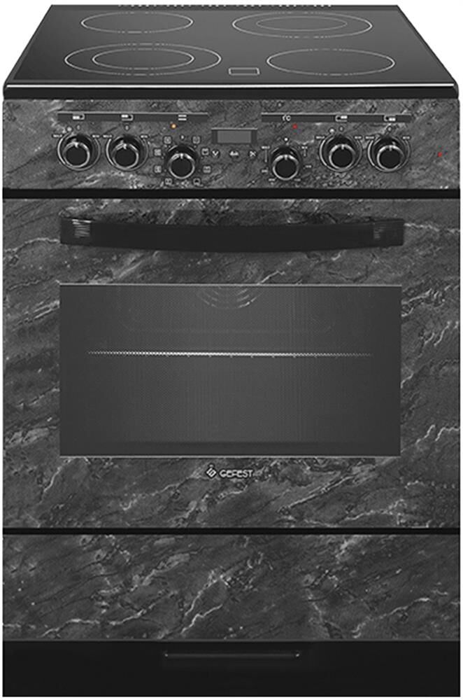 Цвет: черный с рисунком "мрамор". Варочная поверхность: стеклокерамическая. Габаритные размеры ШхГхВ: 60х60х85 см. Объём духовки: 55 л. Вертел с электроприводом * Объемный нагрев с конвекцией * Выдвижной ящик для посуды и принадлежностей * Подсветка духовки двойная * Гриль * Съемные проволочные направляющие духовки * Двухзонная конфорка * Таймер сенсорный многофункциональный * Ножки регулировочные * Ускоренный нагрев с конвекцией.