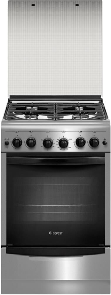 (ШхГхВ) 50x58,5x85 см. Варочная поверхность нержавеющая сталь. 4 газ. горелки. Электророзжиг горелок стола: кнопка розжига на панели. Гриль горелка. Полезный объём духовки 52 л. Таймер: механический. Газ-контроль духовки. Вертел с электроприводом. Направляющие духовки: съемные проволочные. Ящик для посуды и принадлежностей выдвижной. Подсветка духовки одинарная. Стеклянная крышка. Цвет: нержавеющая сталь.