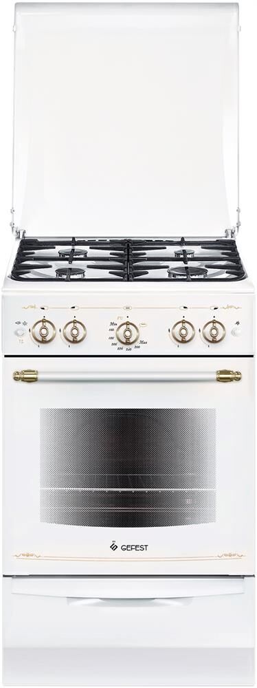 Габариты, ШхГхВ, см: 50x58.5x85; Цвет: белый, с рисунком "ретро"; Дизайн: ретро; Ширина, см: 50; Фасад: эмалированный; Варочная поверхность: эмалированная; Решетки стола: чугунные; Класс электробезопасности: I; Объем духовки, л: 52; Мощность горелки духовки, кВт: 3,1; Мощность гриль-горелки, кВт: 1,9; Газ-контроль духовки; Электророзжиг духовки: кнопка на панели; Электророзжиг горелок стола: кнопка на панели; Гриль: газовый; Подсветка духовки; Направляющие духовки: съемные проволочные; Терморегулятор (термостат); Ящик для посуды и принадлежностей: выдвижной; Ножки регулировочные; Сетевой шнур и вилка: в наличии; Стекло дверцы духовки: двойное; Комплектность: жаровня, накладка для посуды малого диаметра, противень, решетка духовки; Комплект сменных сопел