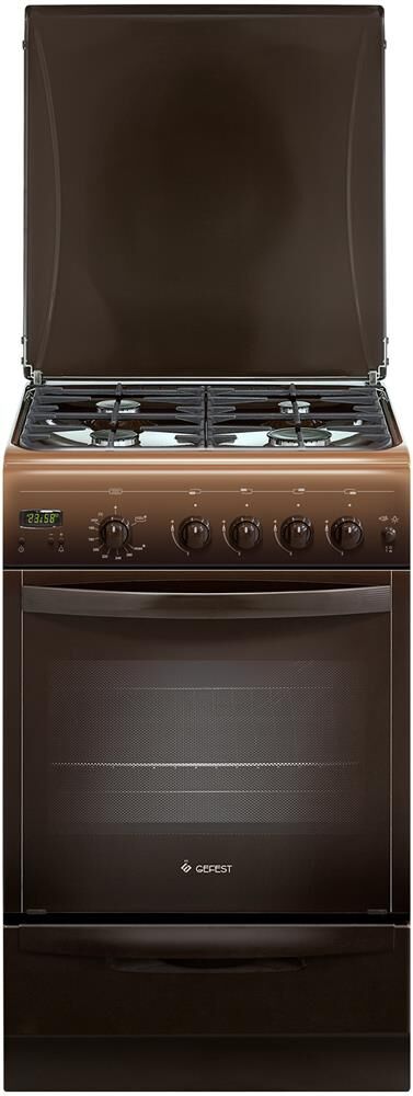Габариты: 50х58.5х85 см. Полезный объем духовки: 52 л. 4 газ. конфорки. Таймер электронный. Газ-контроль горелок стола и духовки. Электророзжиг горелок стола и духовки. Вертел, Гриль, подсветка.; Цвет коричневый