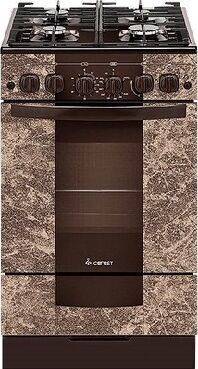 Габариты (ШхГхВ) 50х58,5х85 см. 4 газ. горелки. Электророзжиг горелок стола. Гриль горелка. Решетки горелок стола чугунные. Механический таймер. Полезный объём духовки: 52 л. Газ-контроль духовки. Вертел с электроприводом. Направляющие духовки: проволочные. Термоуказатель. Выдвижной ящик для посуды и принадлежностей. Без крышки. Фасад стеклянный с рисунком "мрамор" коричневый, варочная поверхность: стеклянная.