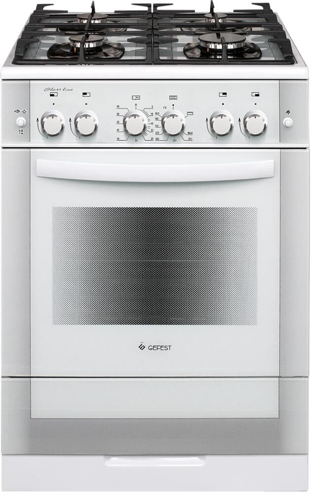 Габариты, ШхГхВ, см: 60x60x85; Цвет: белый; Дизайн: классик; Ширина, см: 60; Фасад: закаленное стекло; Варочная поверхность: закаленное стекло; Решетки стола: чугунные; Класс электробезопасности: I; Объем духовки, л: 52; Мощность горелки духовки, кВт: 3,1; Мощность гриль-горелки, кВт: 1,9; Таймер: механический; Газ-контроль духовки; Электророзжиг духовки: кнопка на панели; Электророзжиг горелок стола: кнопка на панели; Гриль: газовый; Вертел с электроприводом; Подсветка духовки; Направляющие духовки: съемные проволочные; Терморегулятор (термостат); Ящик для посуды и принадлежностей: выдвижной; Ножки регулировочные; Сетевой шнур и вилка: в наличии; Стекло дверцы духовки: двойное; Комплектность: жаровня, накладка для посуды малого диаметра, противень, решетка духовки; Комплект сменных сопел