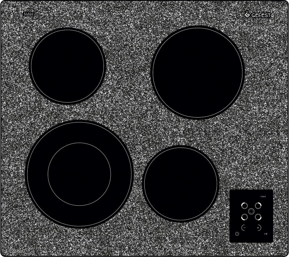 Размеры монтажного проема, ШхГ, см 55,4 х 48,6 * Ширина, см 59,5, Глубина, см 53, Высота, см 6,5 * Количество зон приготовления 4 * Цвет модели Черный. Дизайн Камень * Материал варочной поверхности Стеклокерамика * Двухзонная конфорка варочной поверхности * Таймер * Автоматическое аварийное отключение * Автоматическое защитное отключение * Индикация включения и выключения * Индикация остаточного тепла конфорок стола * Система быстрого нагрева Booster (ускоренный разогрев) * Управление конфорками стола Сенсорное * Управление таймером конфорок стола Сенсорное * Блокировка *