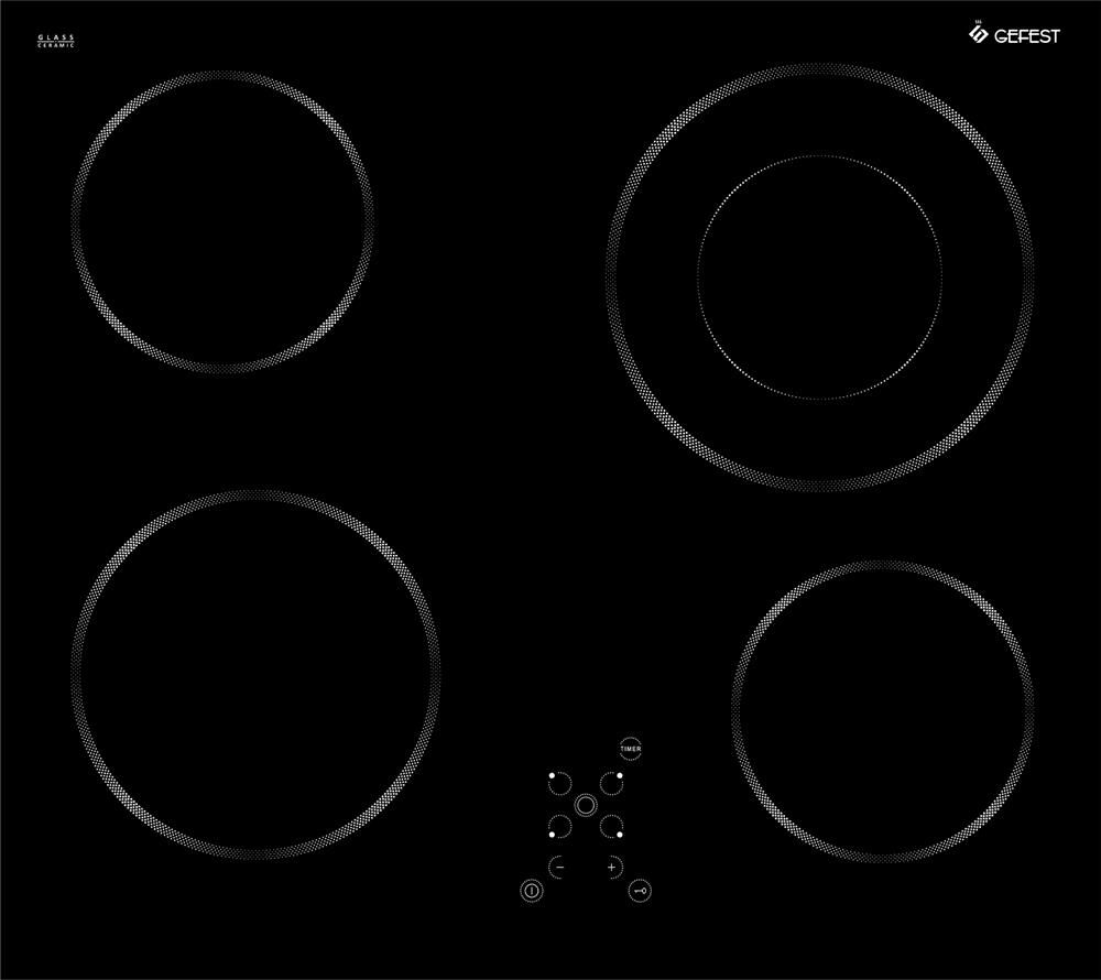 Размеры монтажного проема, ШхГ, см 55,4 х 48,6 * Ширина, см 59,5, Глубина, см 53, Высота, см 6,5 * Количество зон приготовления 4 * Цвет модели Черный * Материал варочной поверхности Стеклокерамика * Двухзонная конфорка варочной поверхности * Таймер * Автоматическое аварийное отключение * Автоматическое защитное отключение * Индикация включения и выключения * Индикация остаточного тепла конфорок стола * Система быстрого нагрева Booster (ускоренный разогрев) * Управление конфорками стола Сенсорное * Управление таймером конфорок стола Сенсорное * Блокировка *
