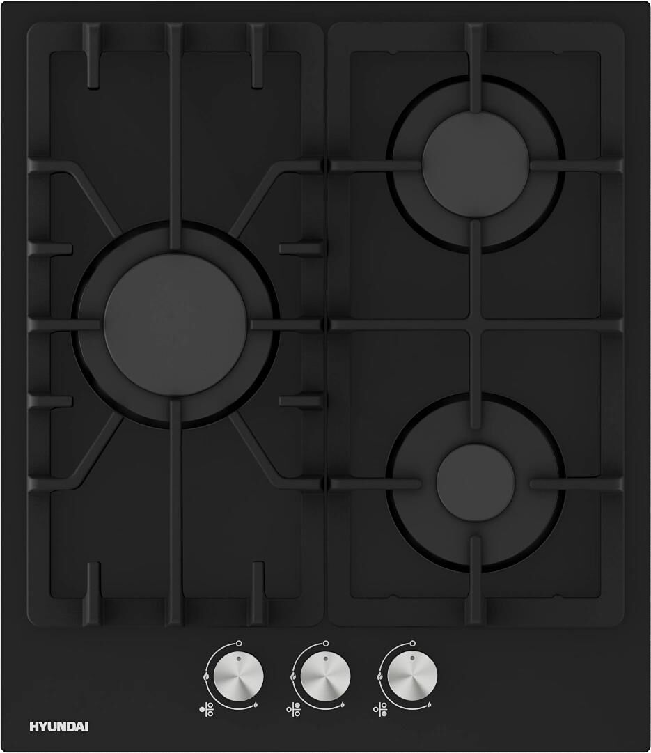 Газовая варочная поверхность, ширина 45 см, 3 газовые конфорки, электроподжиг, фронтальные чугунные решетки, материал поверхности - закаленное стекло, цвет - черный.