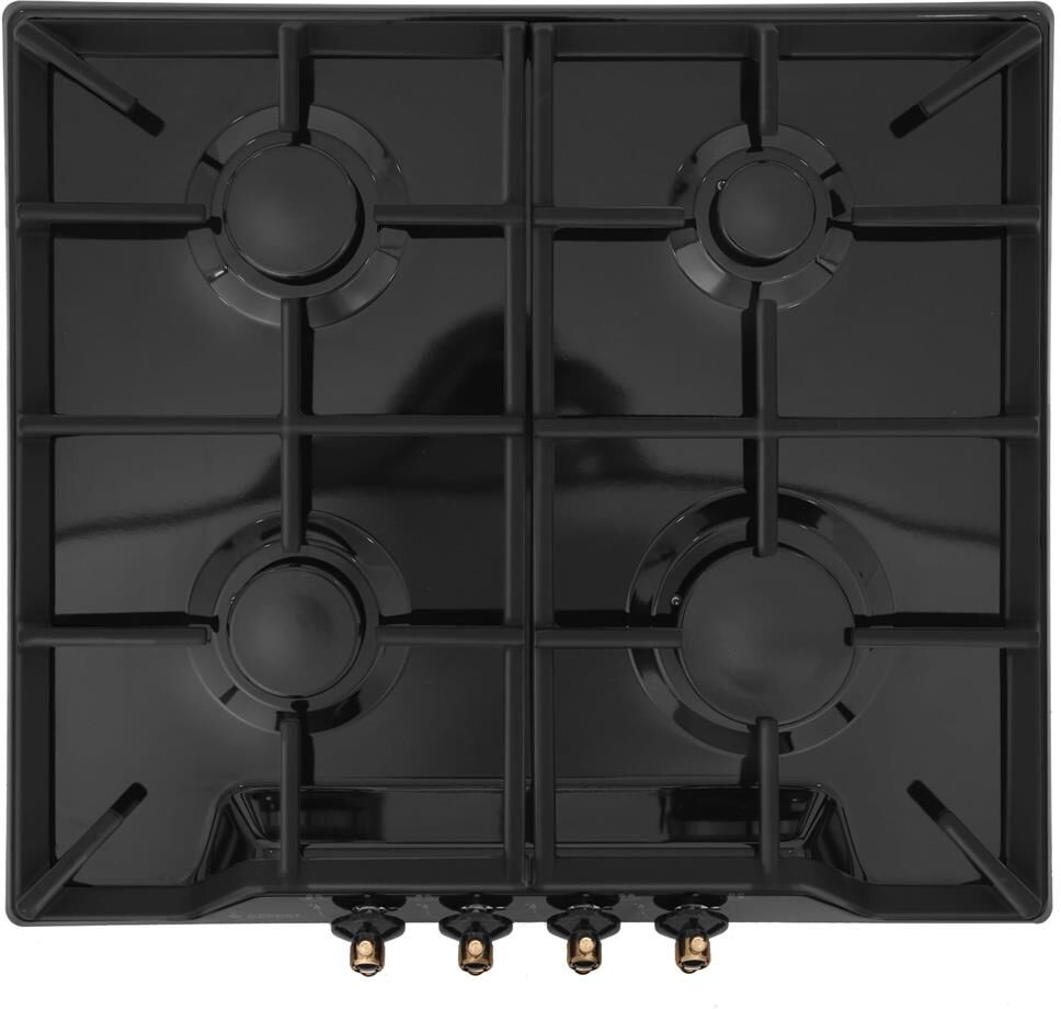Габаритные размеры ШхГхВ: 59х52х9.4 см Газ-контроль горелок стола Чугунные решетки горелок стола Фиксированное положение «малое пламя» Электророзжиг горелок, встроенный в ручки Тип: газовая Количество зон приготовления: 4 Варочная поверхность: эмалированная Диапазон номинальных напряжений, В: 220-230Присоединительная резьба газопровода: G 1/2-В Сетевой шнур и вилка Класс электробезопасности: I Цвет: черный Дизайн: ретро