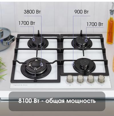 Газовая варочная панель. 4 конфорки. Управление фронтальное. Переключатели поворотные. Материал поверхности: закаленное стекло. Материал решеток/крышек горелок: чугун. Общая мощность: 8100 Вт. Газ-контроль. Электроподжиг на каждой ручке. WOK-конфорка. Адаптер для вока. Адаптер для кофе. Переходники для разных типов газа: для газа G30/30mbar в комплекте. Габариты (ШхГхВ): 580*520*52 мм. Длина шнура питания - 900 мм. Цвет: Белый.