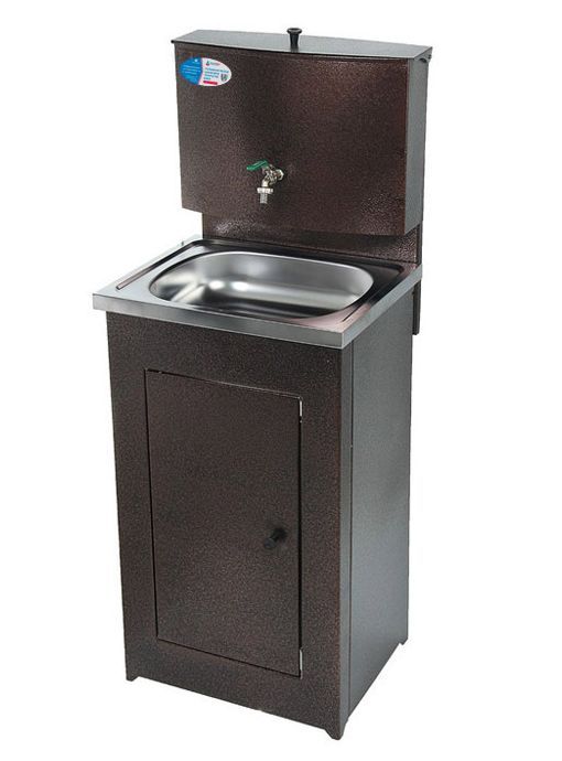 Бак - оцинкованная сталь, Объем бака - 20 л, раковина - нерж. Сталь, тумба - черный металл. Размеры умывальника: 55 х 150 х 45. Вес: 12 кг. Преимущества умывальника «Акватекс» перед аналогичными моделями других производителей: Гальваническое цинковое покрытие бака (новая технология); Продукция сертифицирована; Металлический шаровый кран; Усиленная стойка бака; Отсутствие петель (источник появления коррозии); Тумба на ножках (циркуляция воздуха под тумбой сохраняет ЛКП от преждевременной коррозии); Увеличенная дверца тумбы (для удобства выемки отливной тары); Увеличенная высота тумбы; Коробка евростандарта с ручками (удобство транспортировки). Пробка для слива воды в баке.
