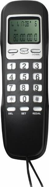 Проводной телефон с дисплеем, узкий корпус. Кнопки набора номера на базе. Пауза/ Повтор набора номера. Переключение. Системы определения номера входящего звонка (Caller ID), 32 входящих, 16 исходящих номеров в памяти. Импульсного /Тонового набора номера. Настольное и настенное крепление.