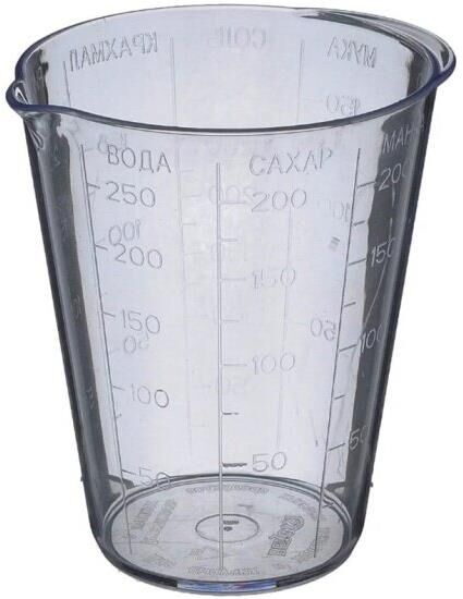 Материал: полистирол Размер: 9*9*10 см Индивидуальная упаковка: стикер, пакет Важные характеристики: Цвет: прозрачный Объем: 0,25 л. Сужающийся носик для максимально комфортного и аккуратного использования; деления для 8 видов жидкостей и сыпучих продуктов; использовать и мыть при температуре не выше 40°; не разогревать в микроволновке.
