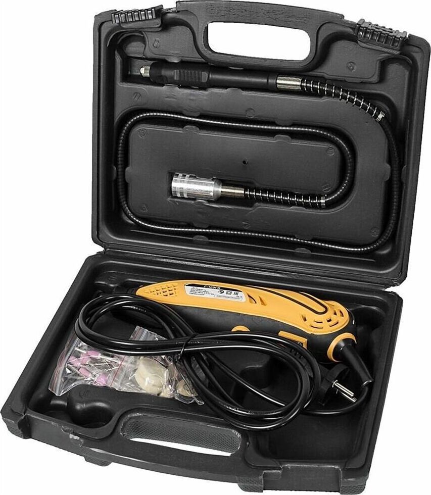 Тип двигателя щеточный. Мощность, Вт 160. Размер цанги, мм 2.3-3.2. Частота вращения шпинделя, об/мин 9000-34000. Электронная регулировка оборотов есть. Комплектация чемодан/кейс. Гибкий вал в комплекте да. Вес нетто, кг 0,7.