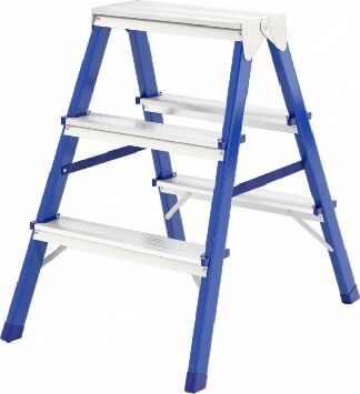 Складная стремянка с окрашенным порошковой эмалью стальным профилем оснащенным ступеньками с двух сторон и верхней рифленой противоскользящей площадкой которое можно использовать как сидение.страховочные ремни для дополнительной устойчивости и предотвращения складывания и пластиковые наконечники на ножках предотвращающие скольжение высота ступеньки 64 см габариты в сложенном виде 71х44х16 предельно допустимая нагрузка 150 кг с учетом динамической нагрузки. Цвет в ассортименте (синий, красный, серебристый)