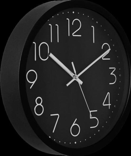 Часы настенные, модель 76760782, размер 305 Х 50 мм, материал пластик,стекло минеральное,обод широкий чёрный матовый, рельефные цифры серебро