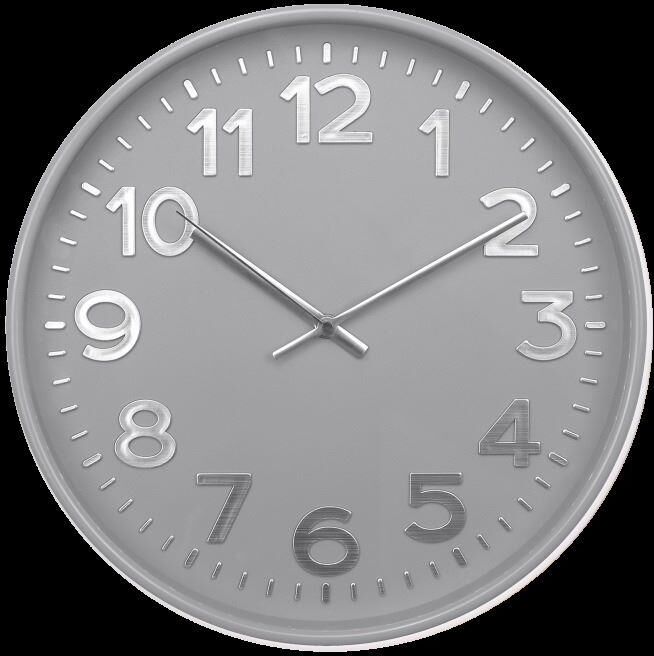Часы настенные пластиковые, модель 78772784, размер 305*305*50 мм, стекло минеральное, пластиковый обод, цвет-серый глянцевый, рельефные цифры с тиснением фольгой под серебро.