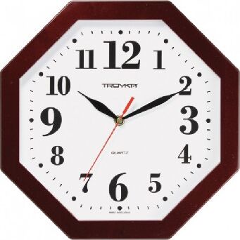 Категория: настенные, Тип механизма: кварцевый, Материал корпуса: пластик, Точный размер корпуса: 290х290х35 мм, Форма корпуса: восьмиугольные, Цвет корпуса: коричневый, Цвет циферблата: белый, Циферблат: стрелочный, Цифры: арабские, Ход: плавный.