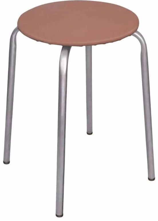 На 4-х опорах, мягкое круглое сидение, легко штабелируются, материал сиденья прочный, устойчивый к истиранию и легкий в чистке, пластиковые колпачки на ножках защищают поверхность пола от царапин, допустимая нагрузка не более 100кг , каркас - стальная труба, сиденье - винилискожа, основание - МДФ, колпачки на ножках - пластик.