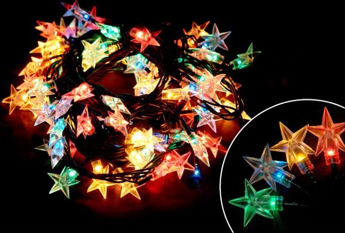 Электрогирлянда "Звезды" Star-100-5-MC. многоцветная. 100 рисовых ламп. длина рабочей части 5м. 8 режимов работы. орнамент - прозрачные звездочки. шнур зеленый. питание от сети 220-240В, 50 Гц. для использования внутри помещений, класс защиты IP20. мощность 31Вт. картонная коробка. ПВХ, алюминий, медь, лампы.