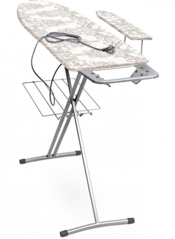 Гладильная поверхность -фанера (1225х345мм), два положения высоты h-70см, h-85см, EUROподставка под утюг с термосиликоном, съемный подрукавник, электросоединитель 2,2м, розетка, полка для белья, материал чехла-хлопок, max нагрузка на глад.поверхность 15.Цвет в ассортименте.