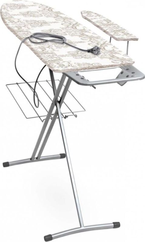 Гладильная поверхность -фанера (1225х345мм), два положения высоты h-70см, h-85см, EUROподставка под утюг с термосиликоном, съемный подрукавник, электросоединитель 2,2м, розетка, полка для белья, материал чехла-хлопок, max нагрузка на глад.поверхность 15.Цвет в ассортименте.