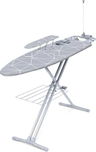 Надёжная металлическая поверхность с отверстиями для пара Съёмный чехол из хлопка с термоустойчивым покрытием Плавно регулируемая высота до 0,9 м Подставка под утюг с термоустойчивыми вставками Кронштейн для провода утюга Полка для белья Переносной подрукавник Электрический соединитель 1,9 м Устойчивые опоры с пластиковыми наконечниками для защиты напольного покрытия Фиксация в сложенном виде Максимальная нагрузка на гладильную поверхность - 25 кг