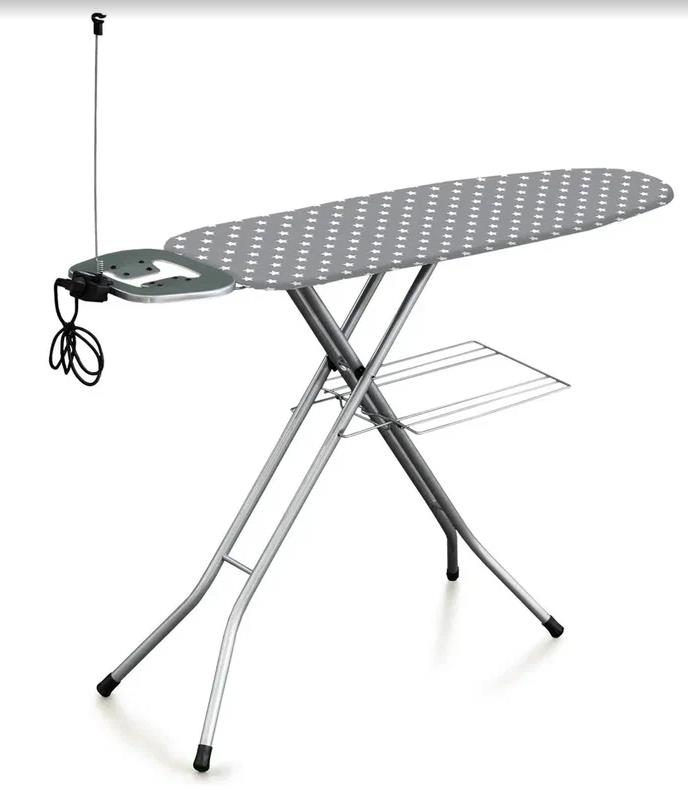 Рабочая поверхность 120х38см. В основе стола метал. моноблок. Регулировка высоты 40-90см. Макс. нагрузка на доску 15.8кг. Полка д/белья. Подрукавник. Розетка с удлинителем 1,5м. Антенна д/шнура. Универс. подставка под утюг. Чехол с тефлоновым покрытием. Вес 7.9кг