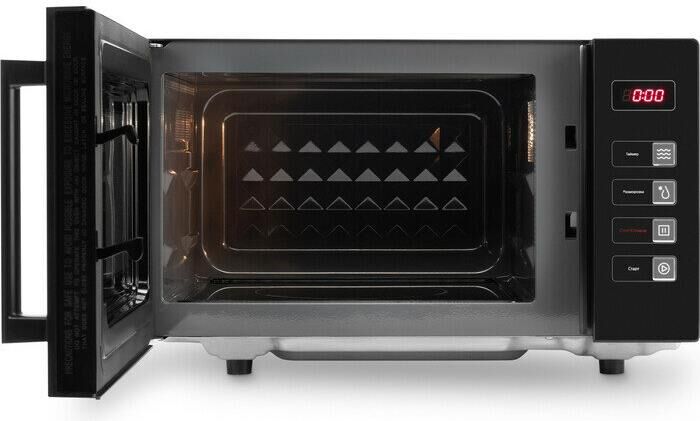HYUNDAI HYM-D3008 подойдет тем, кто ценит в технике стильный и элегантный дизайн. Модель выполнена в черной расцветке, а дверца имеет темную зеркальную поверхность. Благодаря солидному объему внутренней камеры в 23 л в печи можно разогревать еду сразу на несколько человек. Широкий поворотный столик диаметром 27 см обеспечивает равномерный прогрев даже больших порций пищи. Мощность устройства составляет 800 Вт. Это позволяет всего за 1-2 минуты подогреть готовые блюда. Модель также поможет быстро разморозить продукты и приготовить несложные блюда типа омлета, картофеля в мундире или шоколадного кекса в чашке. HYUNDAI HYM-D3008 отличается удобным и интуитивно понятным электронным управлением. Она оснащена дисплеем и четырьмя кнопками: «Старт», «Отмена», «Разморозка» и «Таймер». Для безопасности всю панель управления можно заблокировать от детей. Дверца открывается за ручку, что делает микроволновку надежной и простой в эксплуатации.